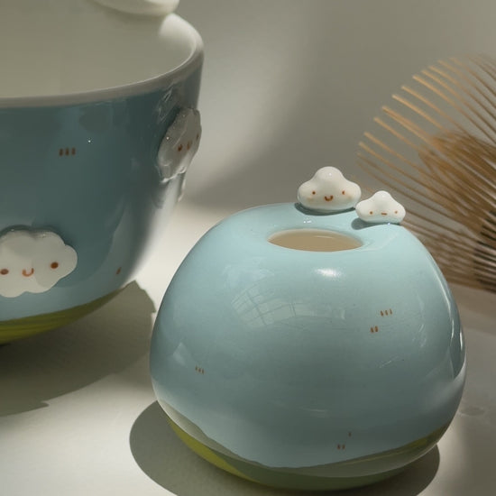 Inspired by the open sky and drifting clouds, this piece combines Mori Mori’s marbled clay technique with Oraclay’s tiny cloud on the rim. Designed as a chasen holder (matcha whisk stand), it’s both functional and charming, with a drainage hole at the bottom to reduce moisture and keep your whisk in good shape 🍵☁️