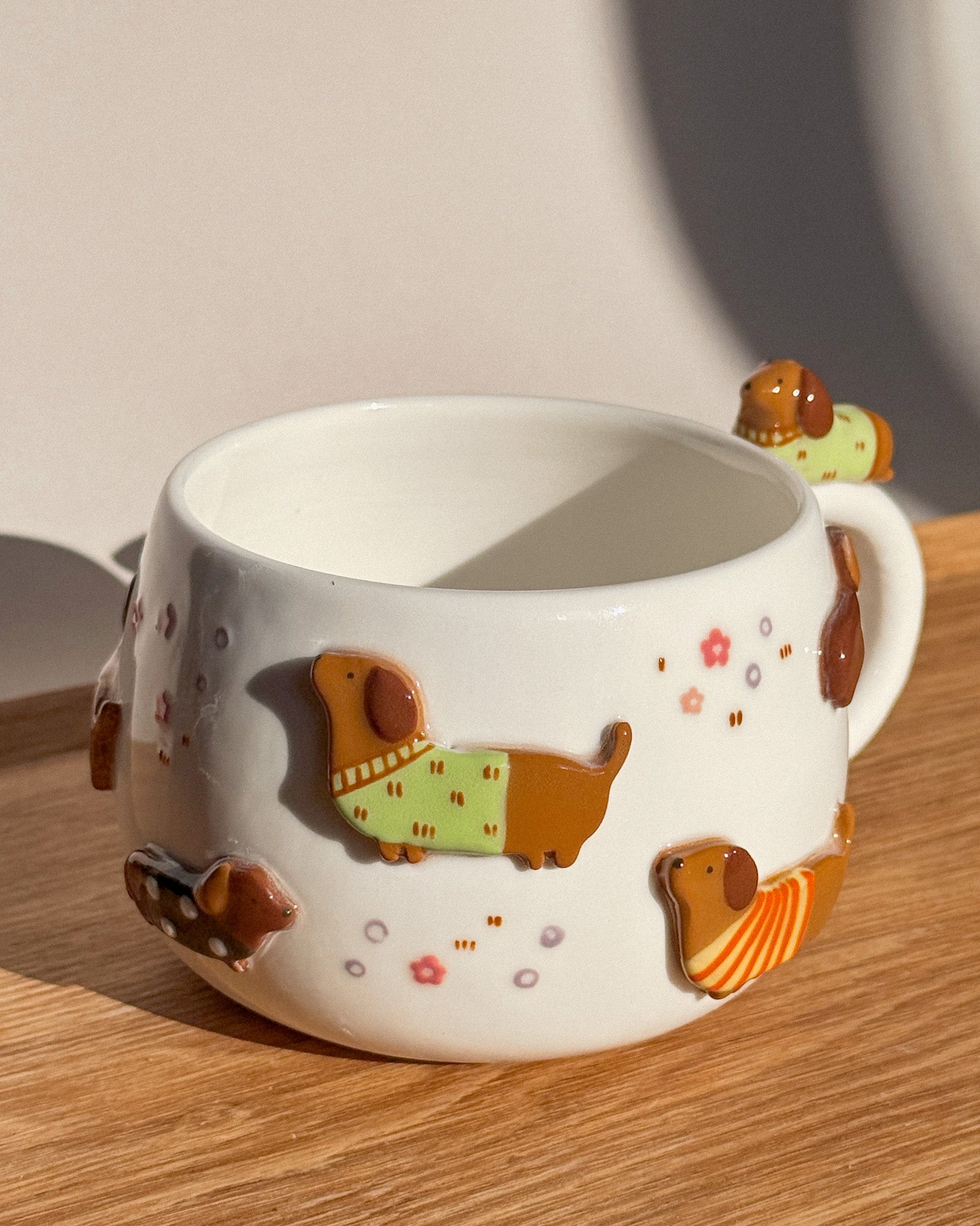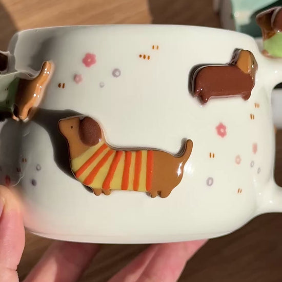 𓐐𓎩 A handcrafted chawan featuring a charming dachshund character perched gently on the rim. With its long body, floppy ears, and calm expression, the dachshund adds a quiet sense of companionship to your matcha moment.